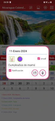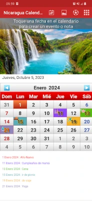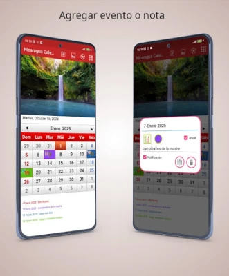 • Agrega eventos o notas con íconos y colores personalizados. • Marca fechas importantes como vacaciones, aniversarios de bodas o cumpleaños. • Establece eventos anuales recurrentes para recordarlos todos los años. • Personaliza tu calendario con tus propias imágenes. • Recibe recordatorios de los próximos eventos. • Elige comenzar la semana el domingo o el lunes. • Salta a la fecha de hoy o a cualquier fecha específica fácilmente.